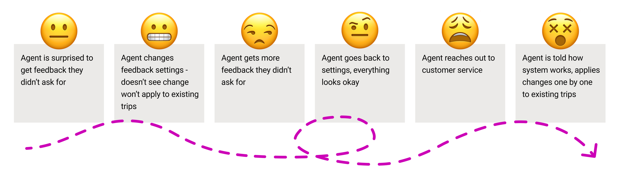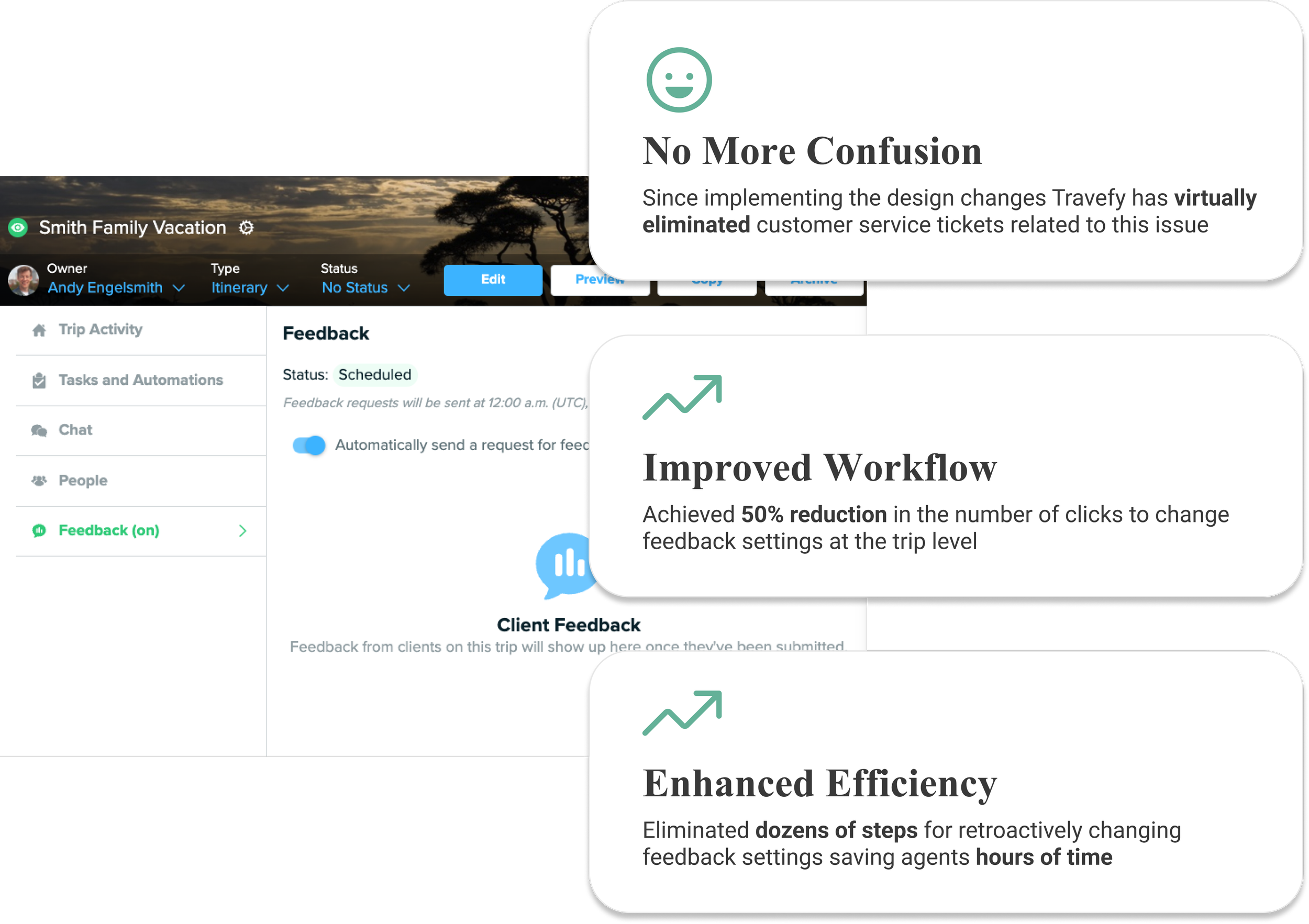 Travefy’s automated post-trip feedback system was unintuitive and difficult to set up resulting in frequent failed messages and misfires. It made travel advisors look unprofessional to their clients and for Travefy it was a source of public complaints on social media and multiple customer service tickets every week.