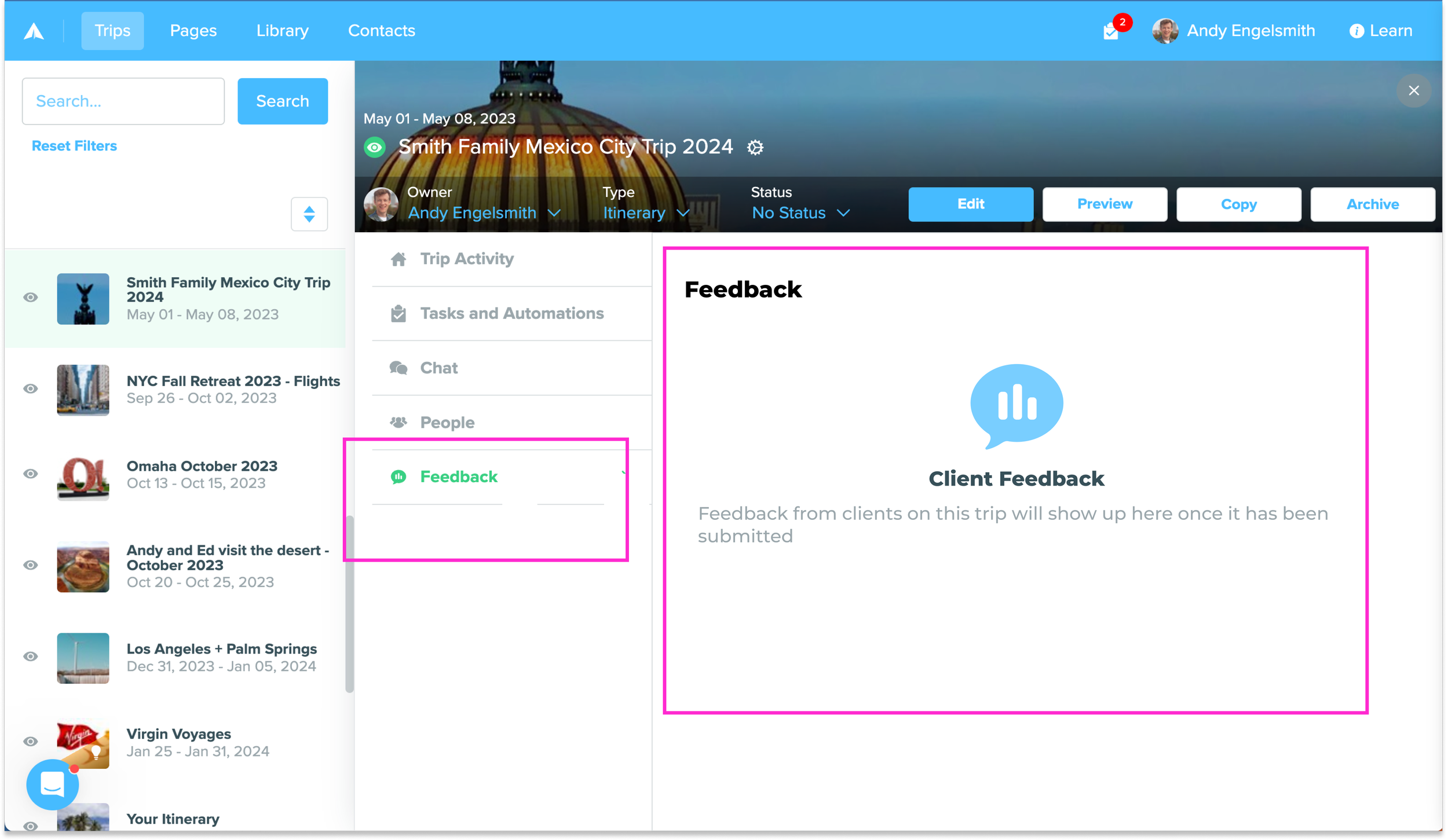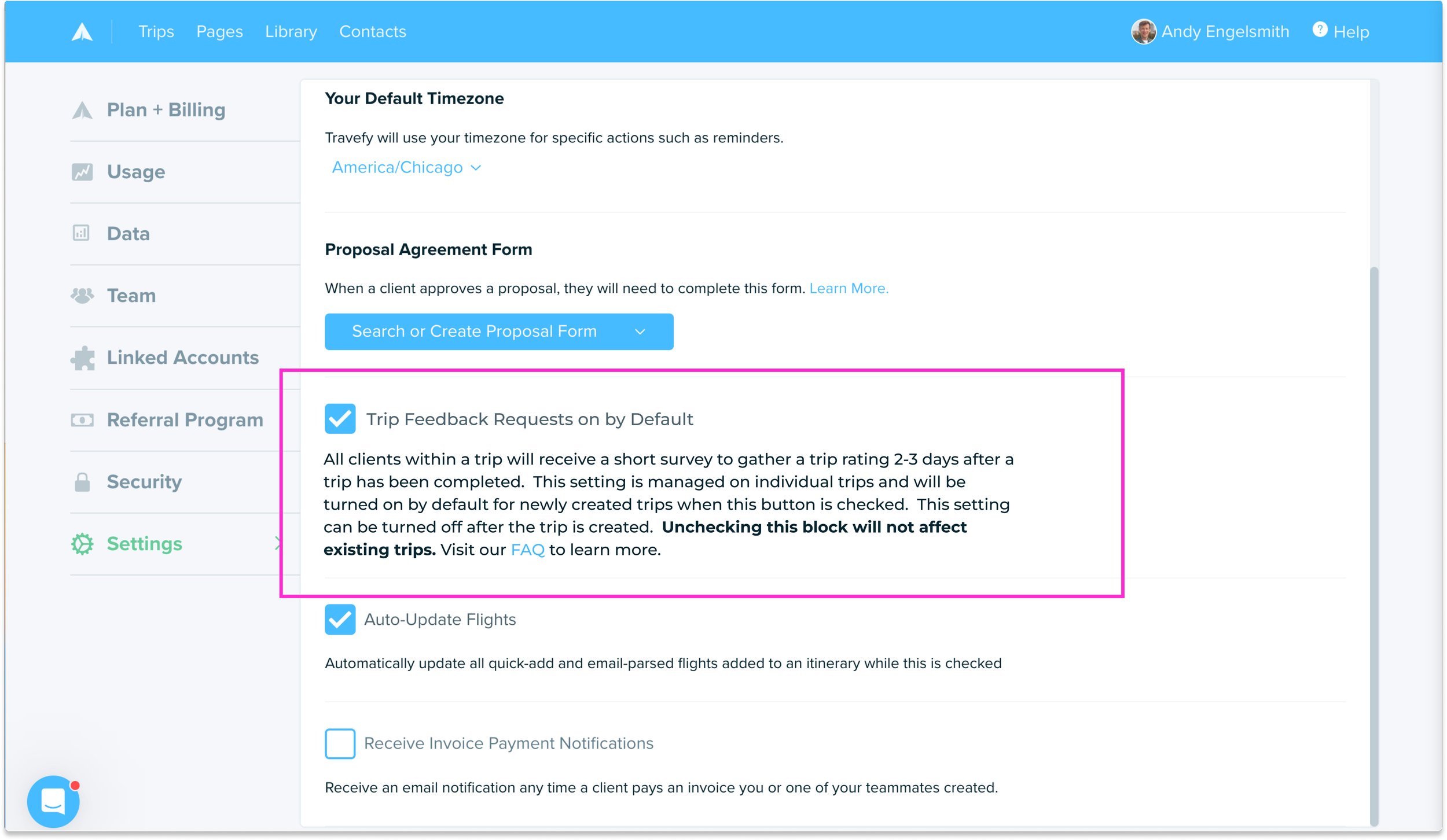 Enhanced workflow by eliminating dozens of steps for Travel Advisors to change feedback settings for existing trips.