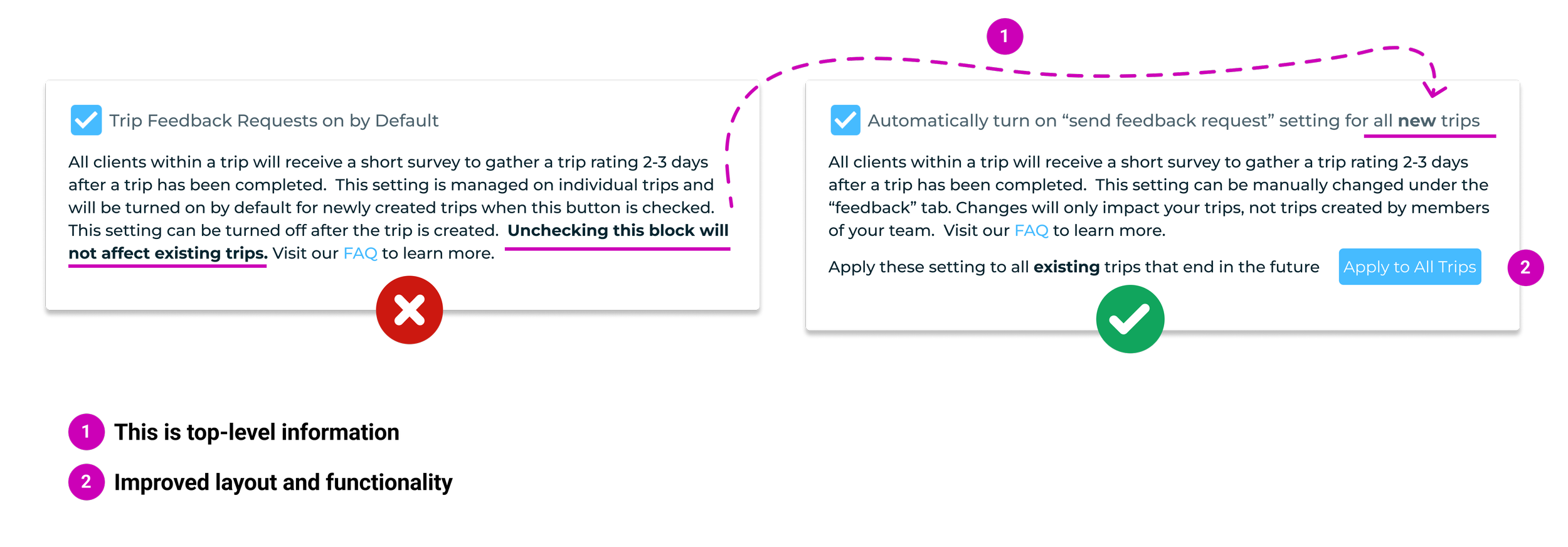 Feedback settings didn’t match user expectations. Users were frequently surprised settings didn’t apply to existing trips. Information that was buried in five lines of text describing the feature.