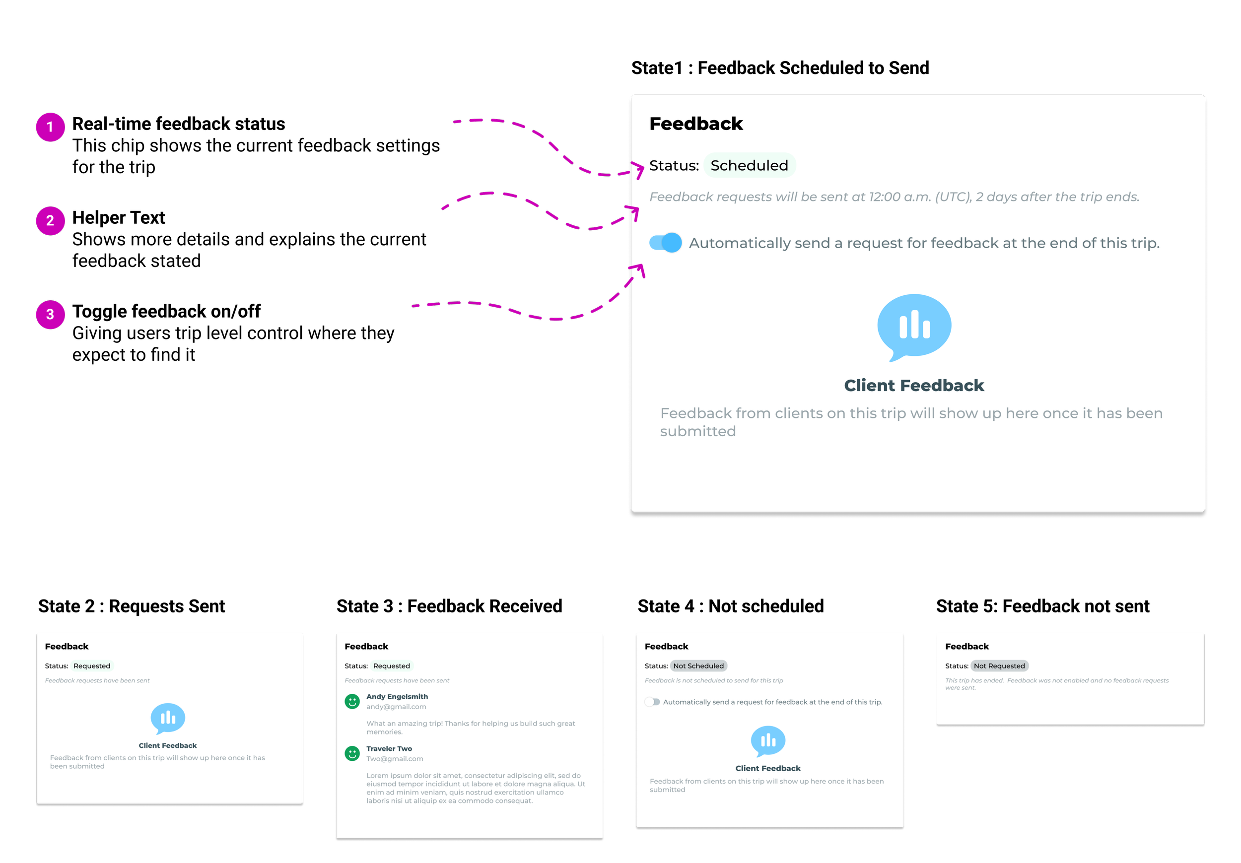 The empty state content of the feedback tab was agnostic to system status despite the fact that this was the easiest to find feedback element in Travefy. I added a status chip, helper text and, an on/off control.